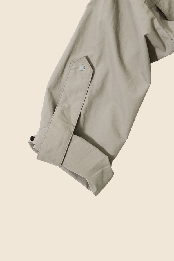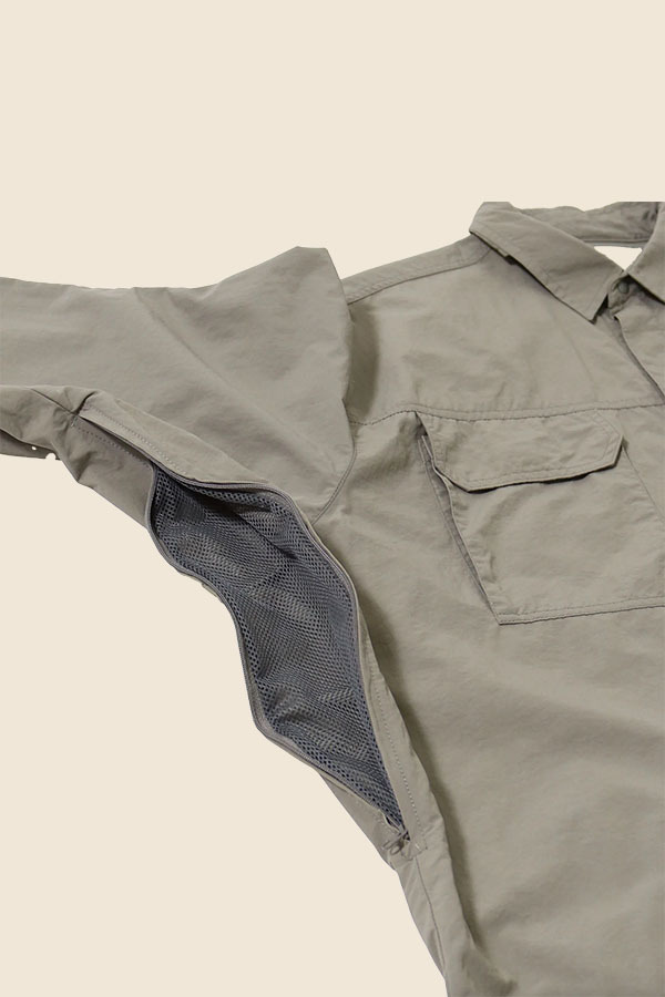側面拉鍊開合的通風功能、可折疊的領子、捲起袖子時的固定帶,最大的特點是有四個口袋