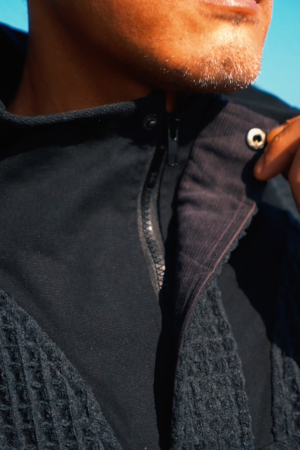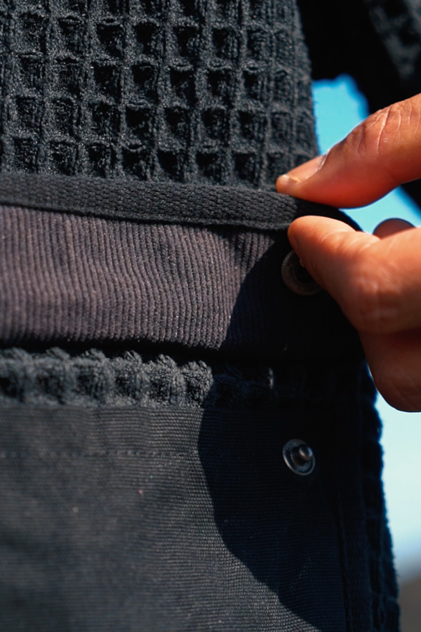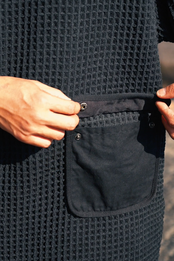 使用厚磅華夫格毛巾布料,幾何拼接剪裁